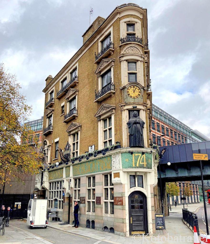 テムズ川のすぐそばの、線路脇に建つ不思議な形をした建物の1階部分に入っているのが、超ユニークな内装のパブ「ブラックフライアー(The Blackfriar)」です。