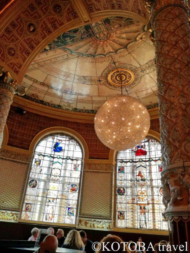 その魅力は何といっても素晴らしい内装、天井から吊り下げられた大きな月のような照明と豪華な装飾が施された柱、ドーム状になった天井はその物自体が美術品です。